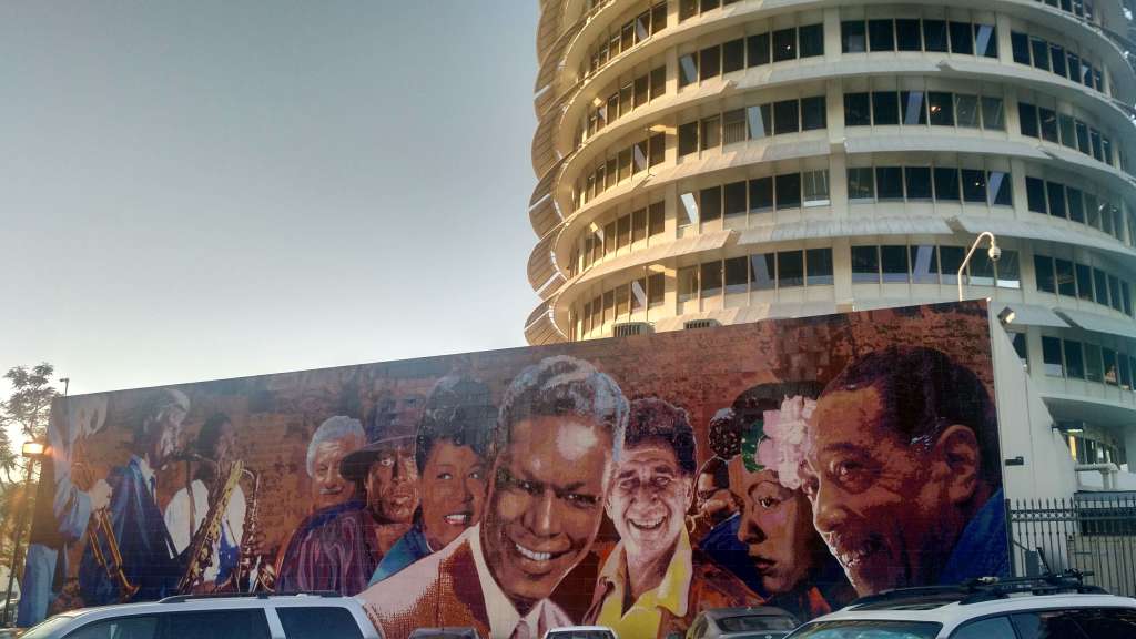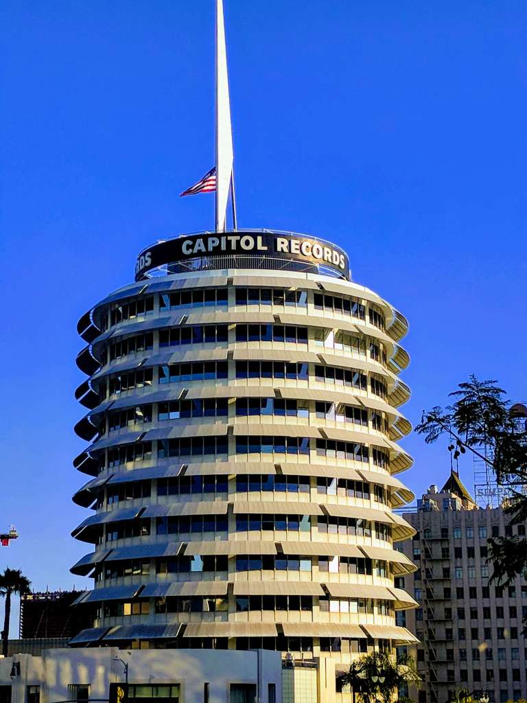 One block from Hollywood Boulevard, look up at the circular 13-story tower home to Capital Records, the 1st West Coast-based music recording studio. Established in 1942, the recording label signed artists like Franck Sinatra, the Beatles, and the Beach Boys.