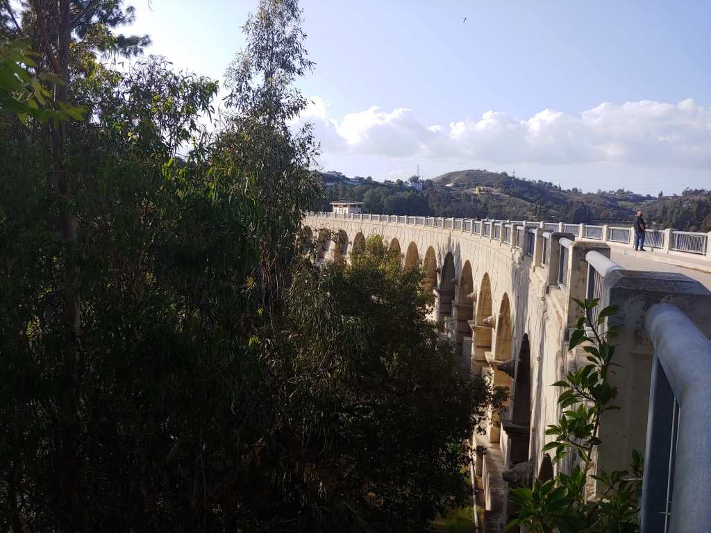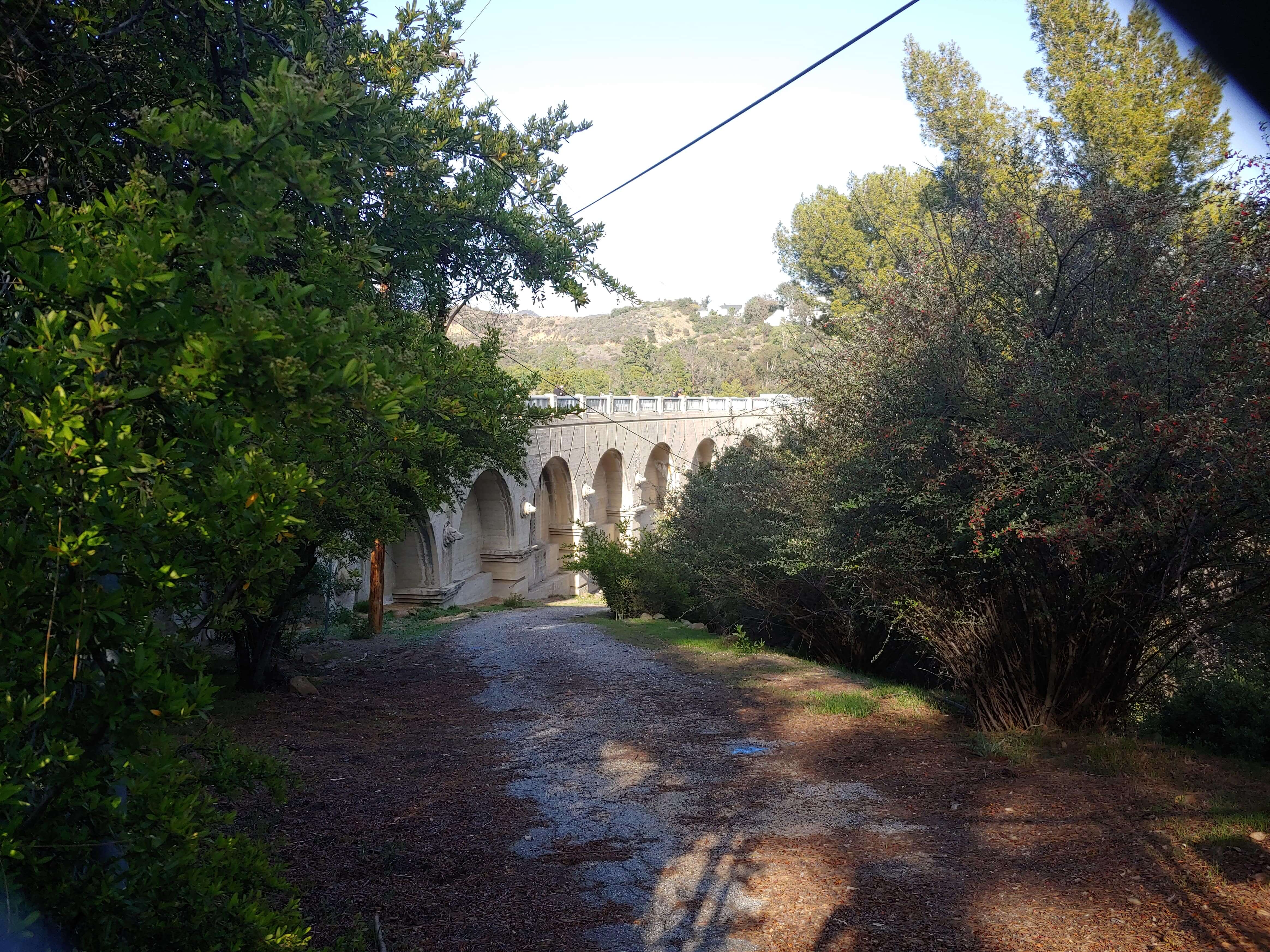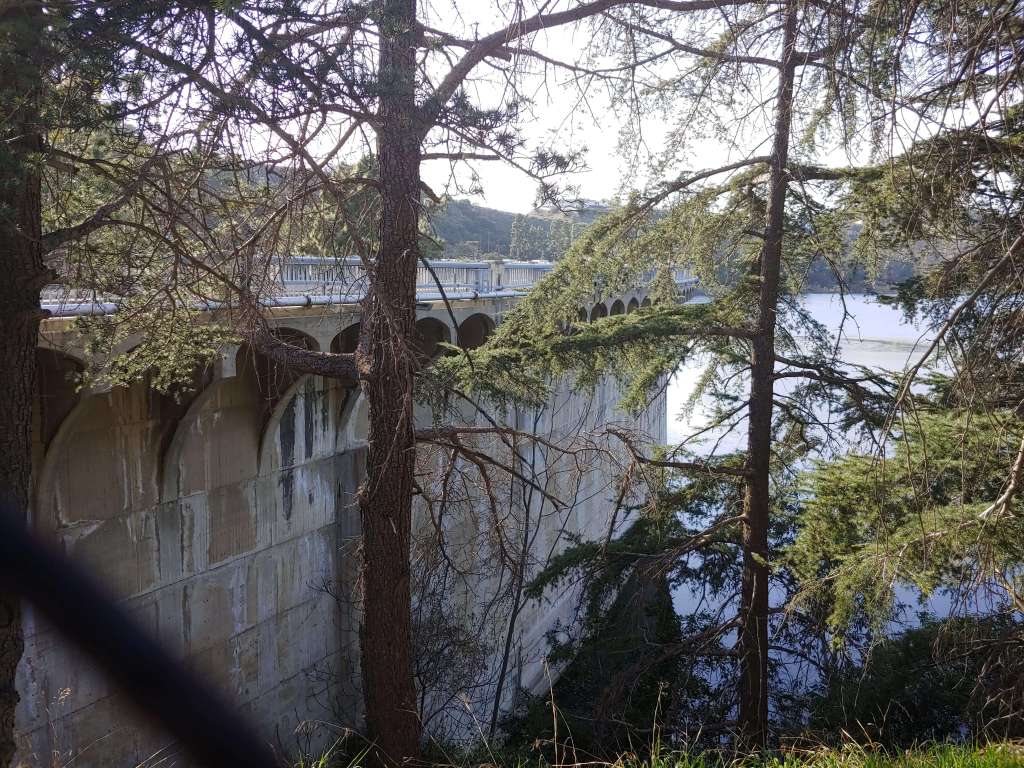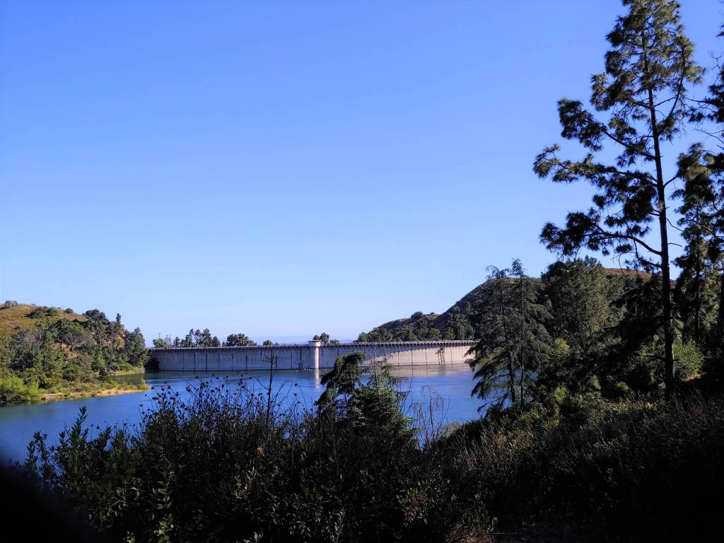 You will be surrounded by the blue lake, lush vegetation, pine trees, and the hills as you are marching toward the Mulholland dam.