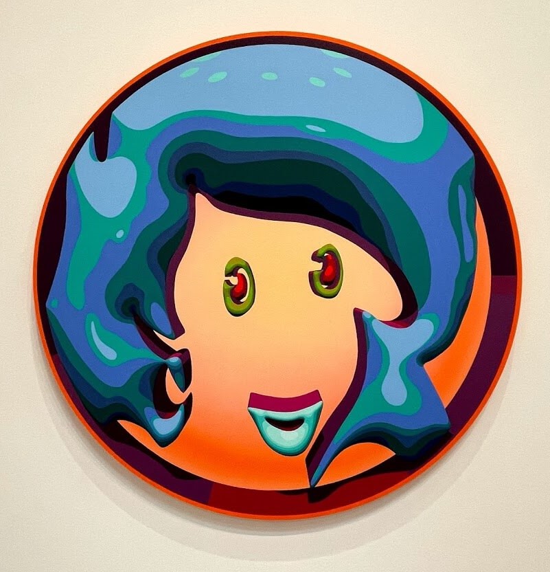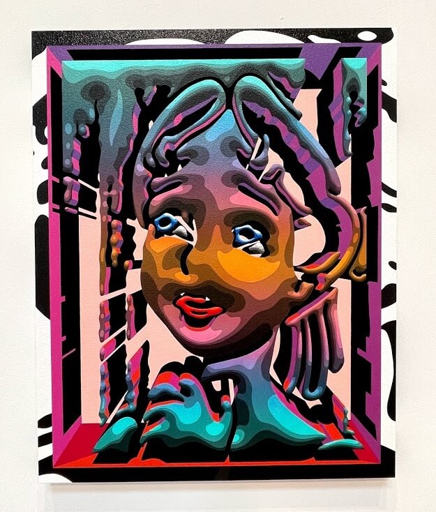 The artist brings his characters to a new dimension and narrative. There is a colorful optical illusion, like a 3-D animation. Frames in movements. Floaters.