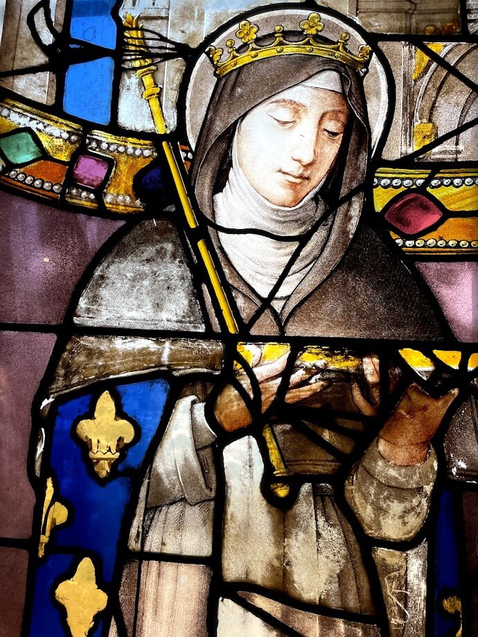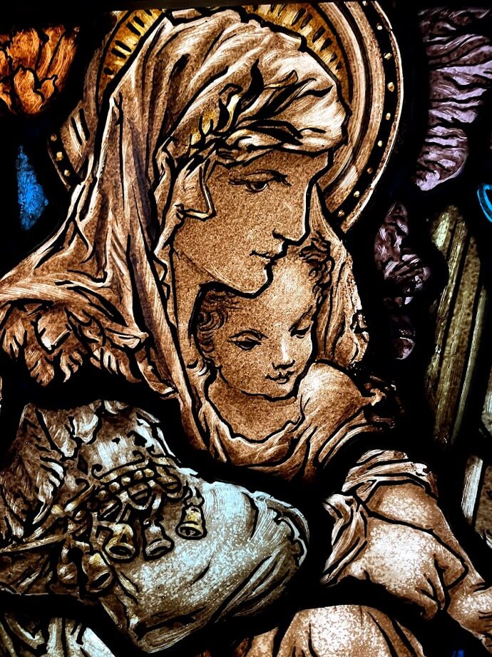 In the 50s, the French technique of “dalle de verre” (slab of glass) was popular. Colored glasses are broken into specific forms and set in a matrix of epoxy. The installation is thinner, and the daylight emphasizes the contrast between the colorful glasses and the dark epoxy.