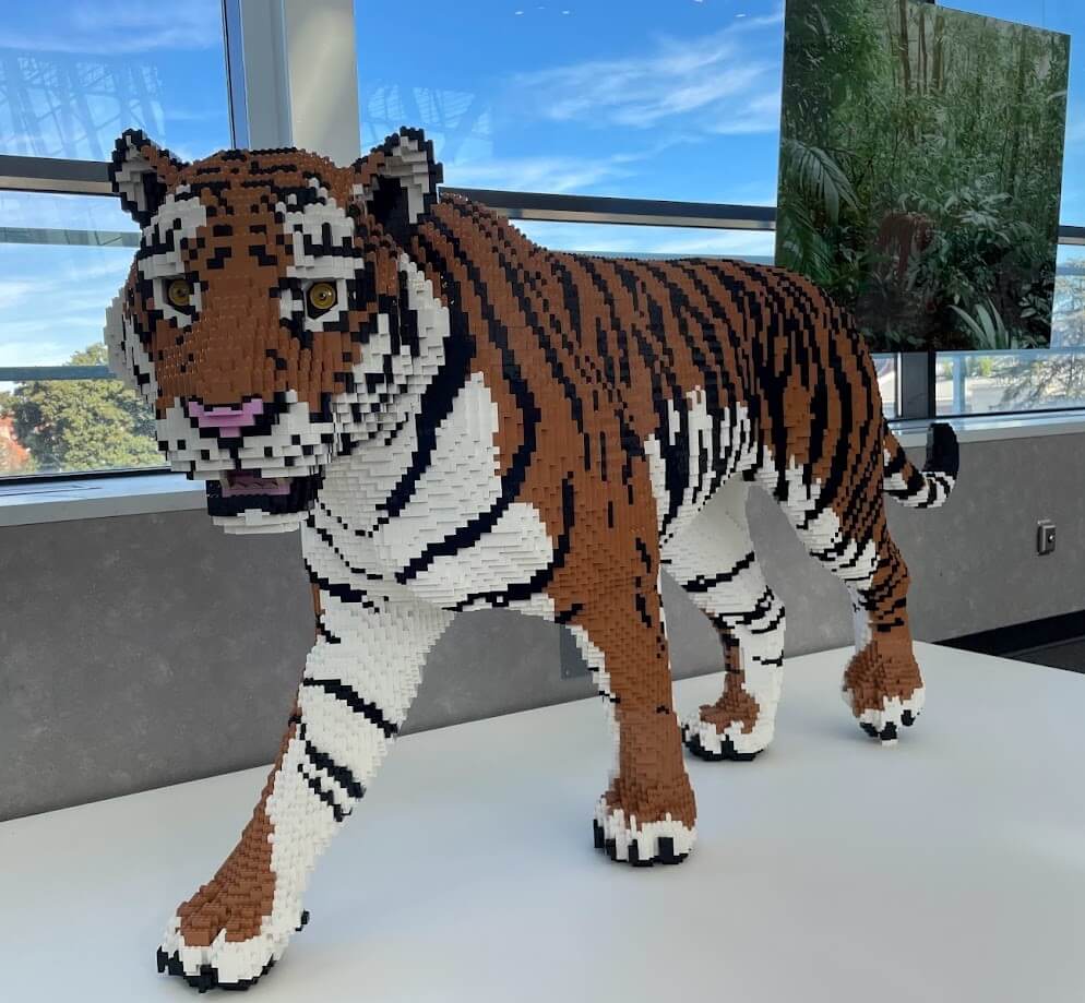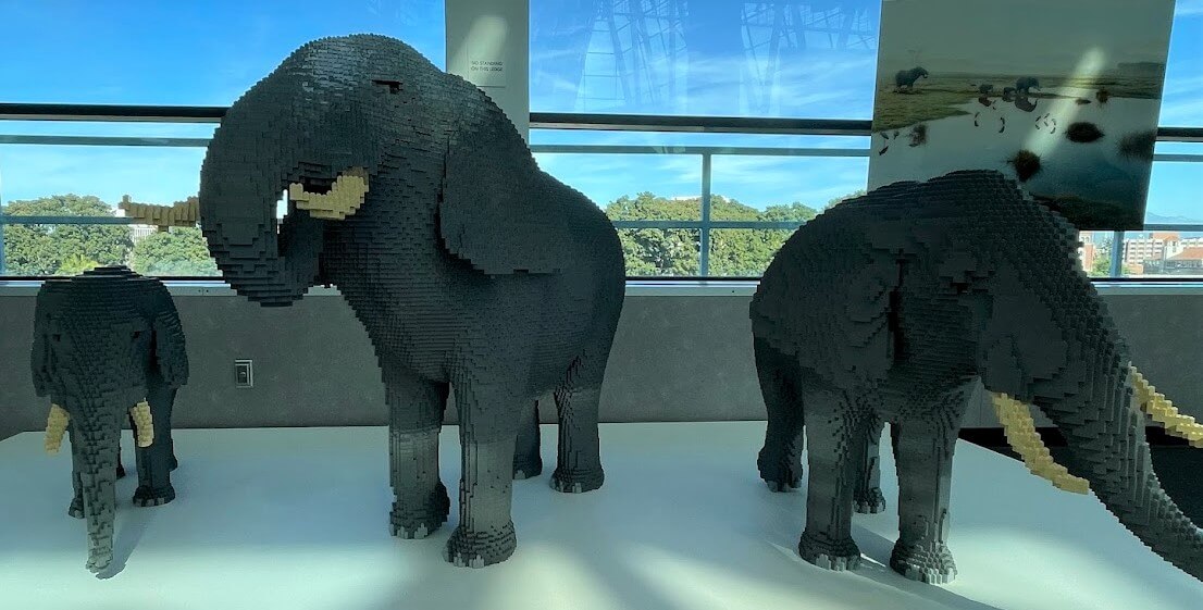 Artist Nathan Sawaya and photographer Dean West collaborated to highlight 13 endangered species: African elephant, whale shark, Western lowland gorilla, polar bear, Northern white rhinoceros, Artic fox, Beluga whale, Cheetah, Chilean flamingo, giraffe, hawksbill, Malayan tiger, and military macaw.