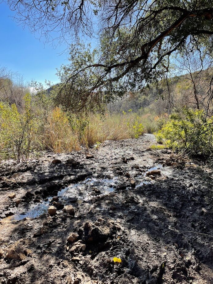 The hike is easy, shady, flat, and pleasant. It was an easy creek crossing after rainy days, and it was muddy.