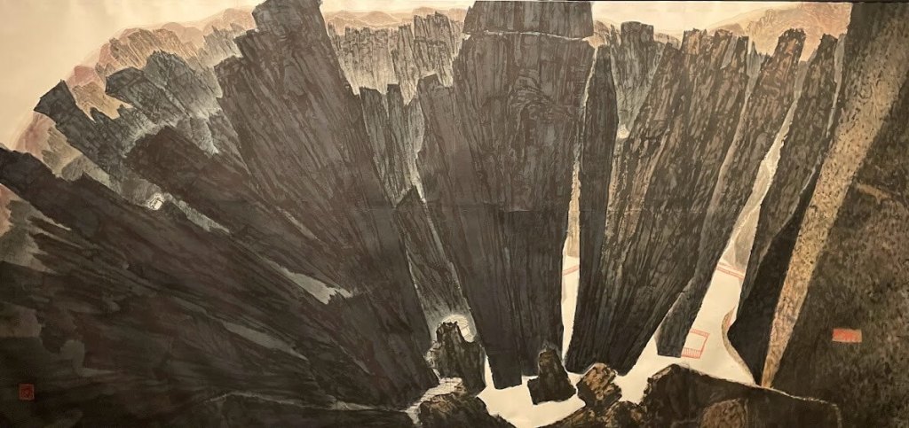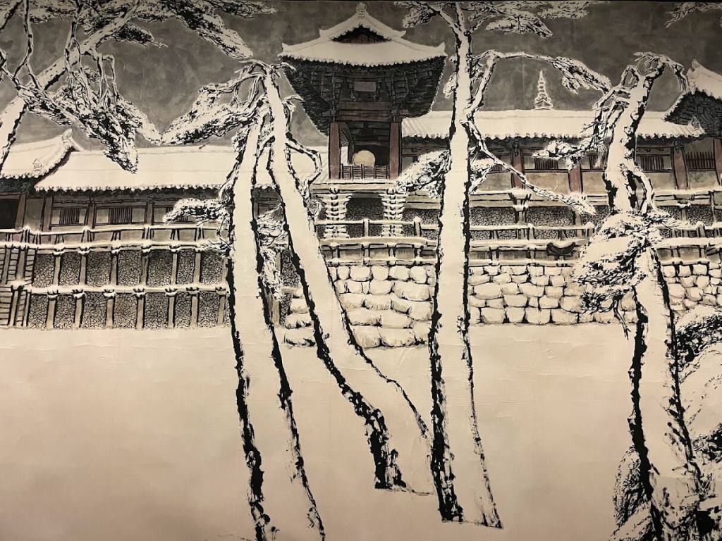 Bulguksa Temple is the largest artwork in the exhibit. The artist used Korean mulberry paper to capture the snowing environment. The result is impressive: a few brushstrokes created a quiet, whitening, and silent scape.