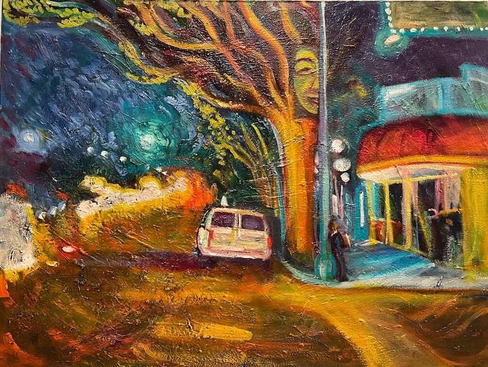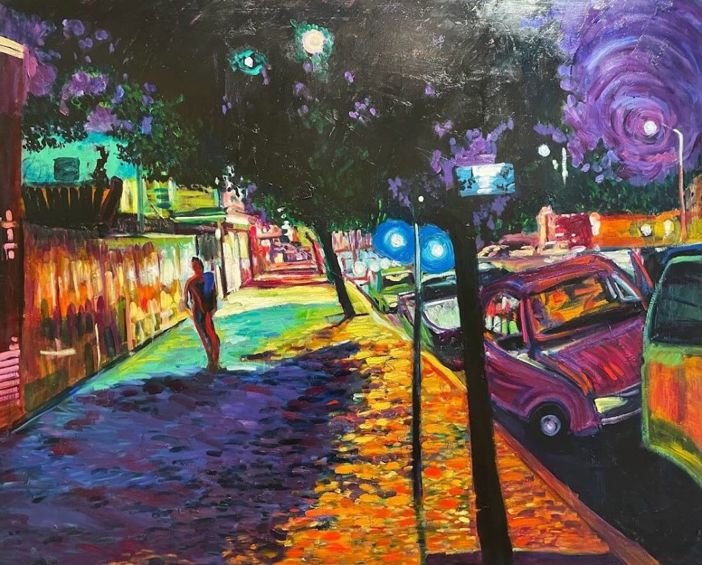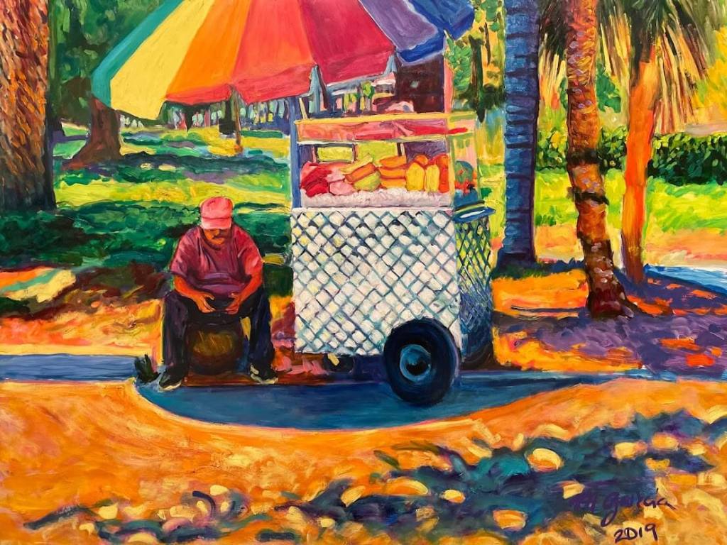 It is an iconic image of Los Angeles: street vendors and palm trees. The artist depicts the visible: a fruit vendor watching his phone while waiting for customers, and the non-visible: precarity of immigrants working for the American Dream.