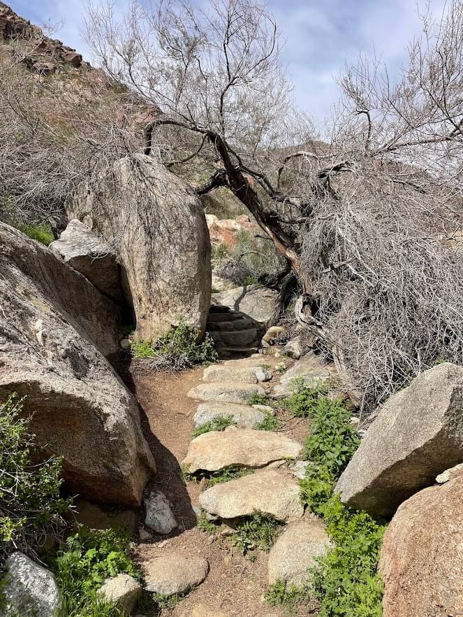 This hike is easy and well-marked. Engage on the sandy path for ~0.5 miles. First, the environment seems arid and rocky. This landscape is the result of flash floods. Boulders are carried down and remained.