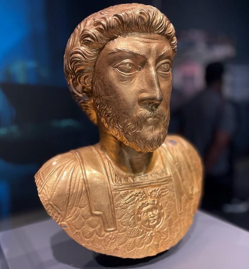 The Gold Emperor from Aventicum showcases a gold bust of Roman Emperor Marcus Aurelius (ruled AD 161-180) alongside other archeological discoveries from present-day Avenches, Switzerland.