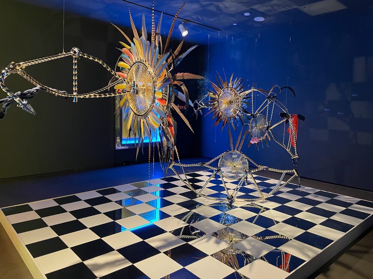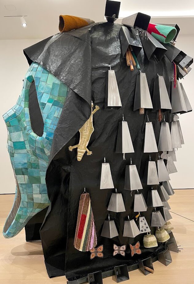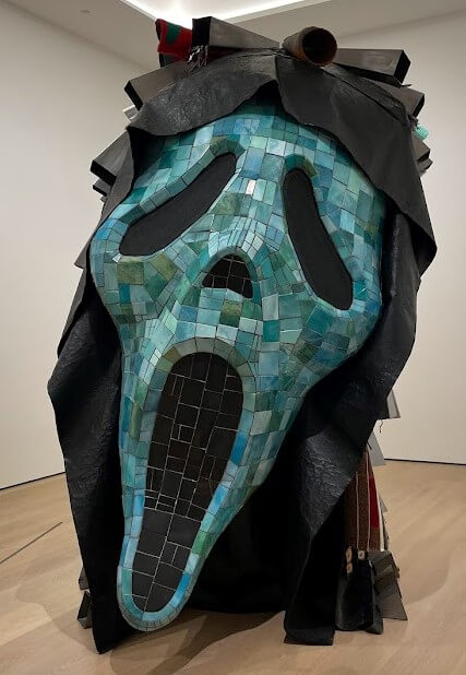 Artist Ishi Glinsky presents an oversized sculpture mixing pop culture representation – the iconic mask from the blockbuster Scream – with ancestral powwow traditions.