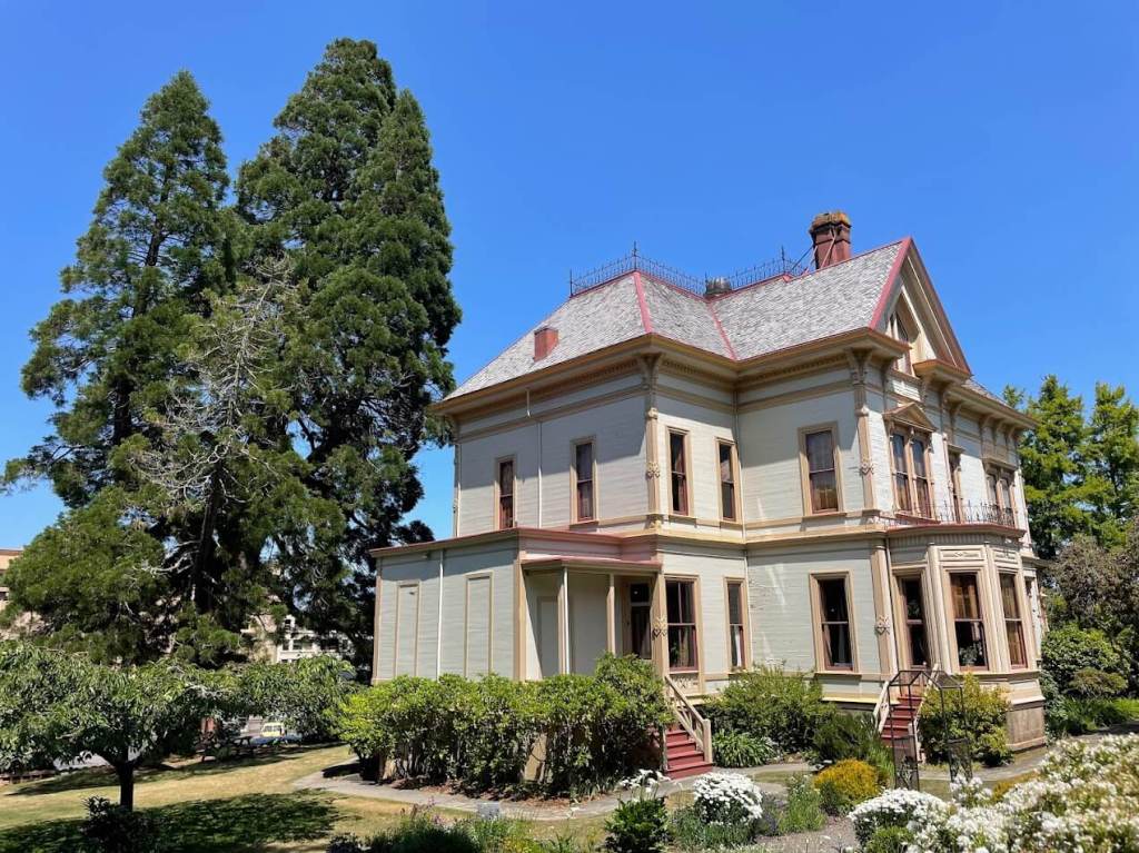 Look at the exterior to see some of the architectural elements of Queen Anne Style like the octagonal-shaped tower, the bay windows, and the wraparound porch.