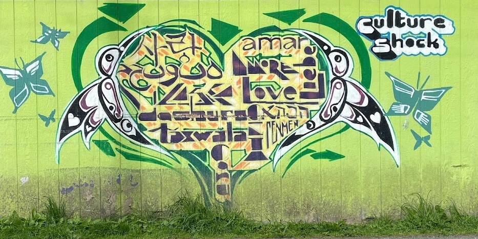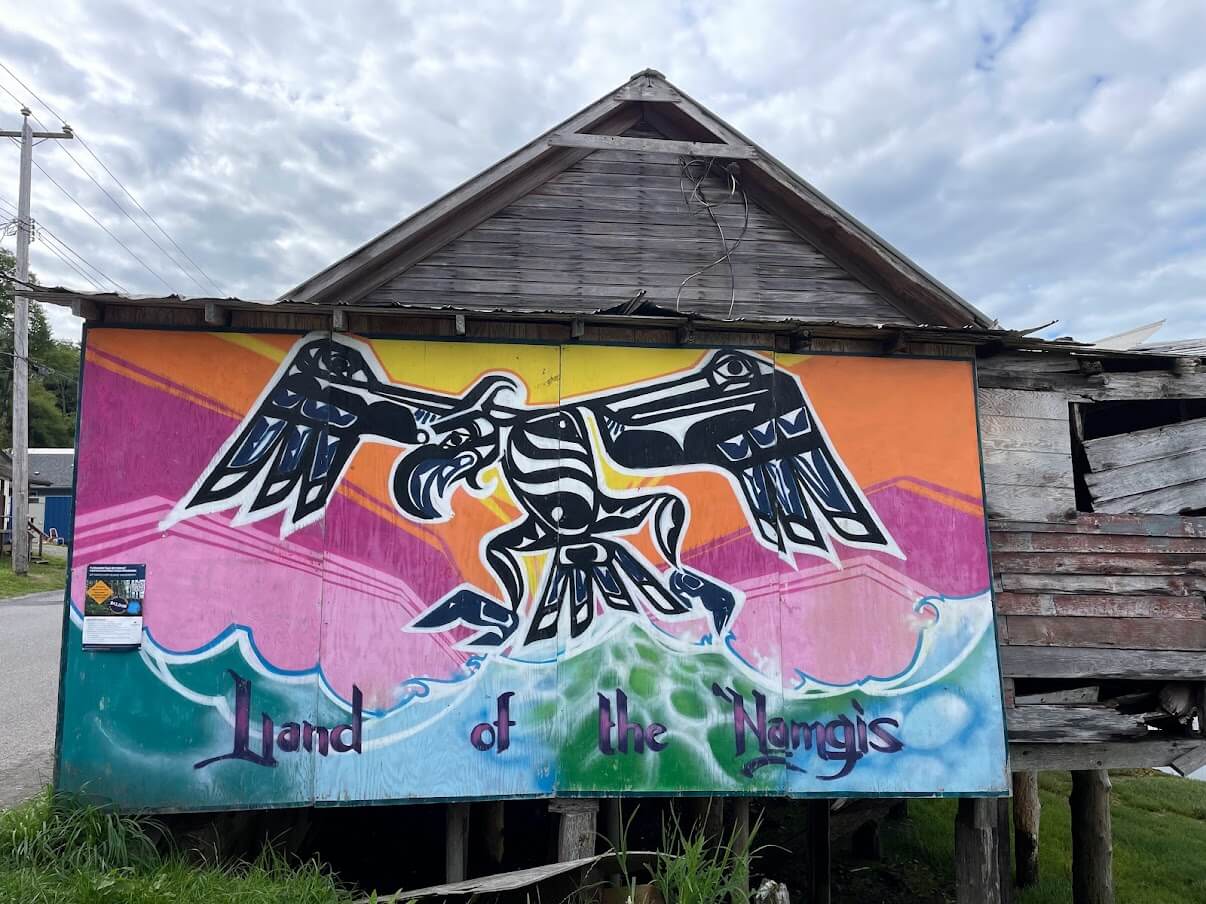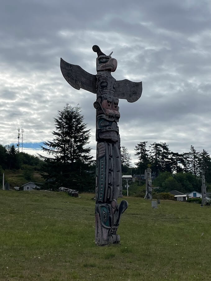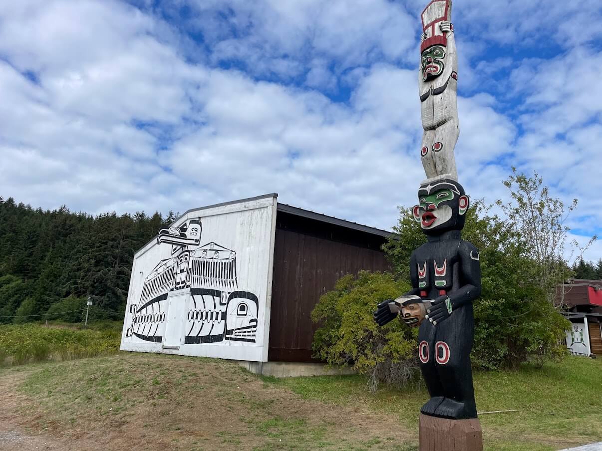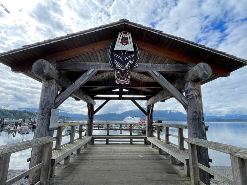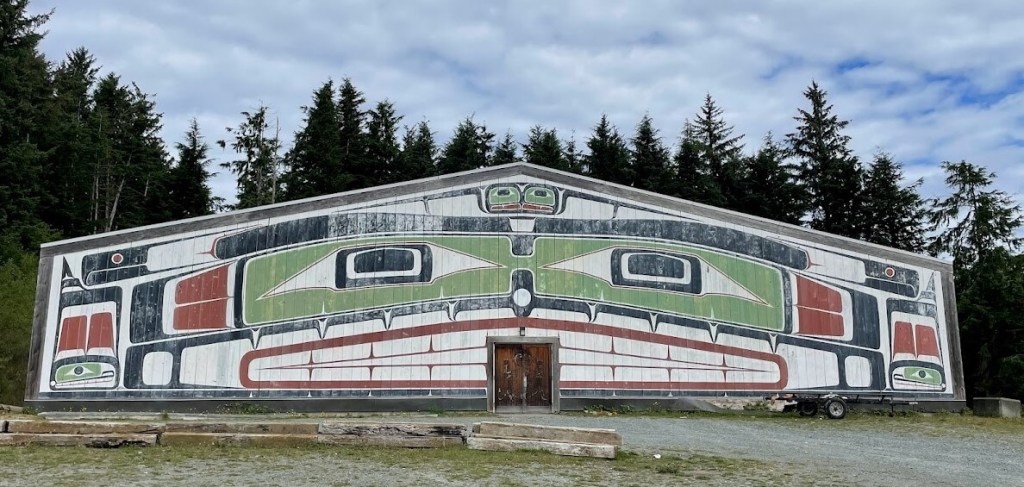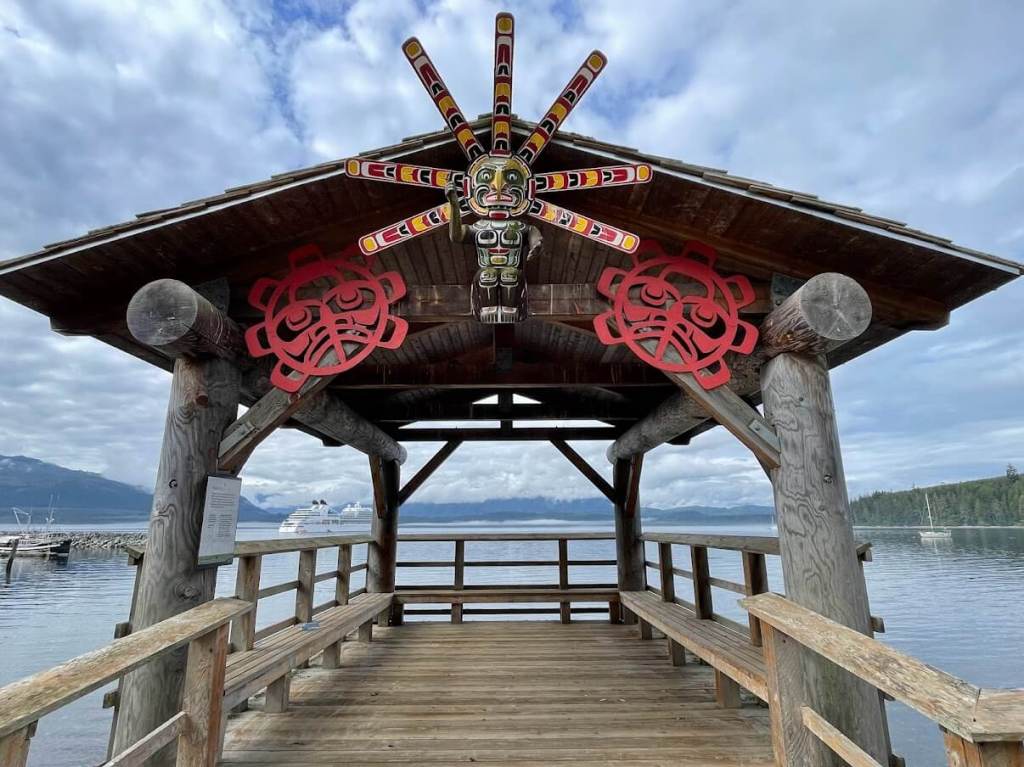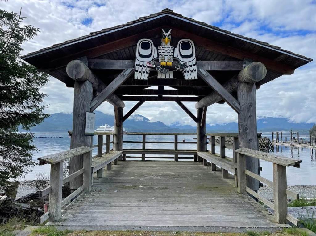 As you stroll the waterfront from the visitor center to the U’mista Cultural Center, you will see five awakwas (structures). Each of them highlights one of the Na’mima (clan) and provides a short story.