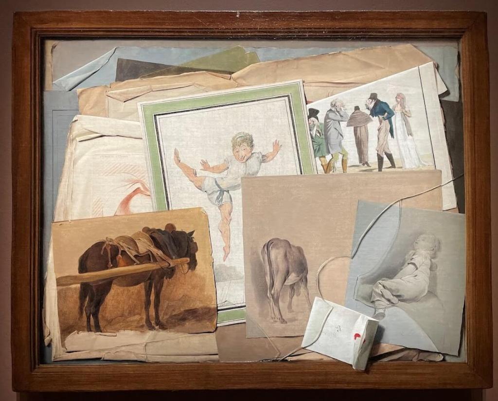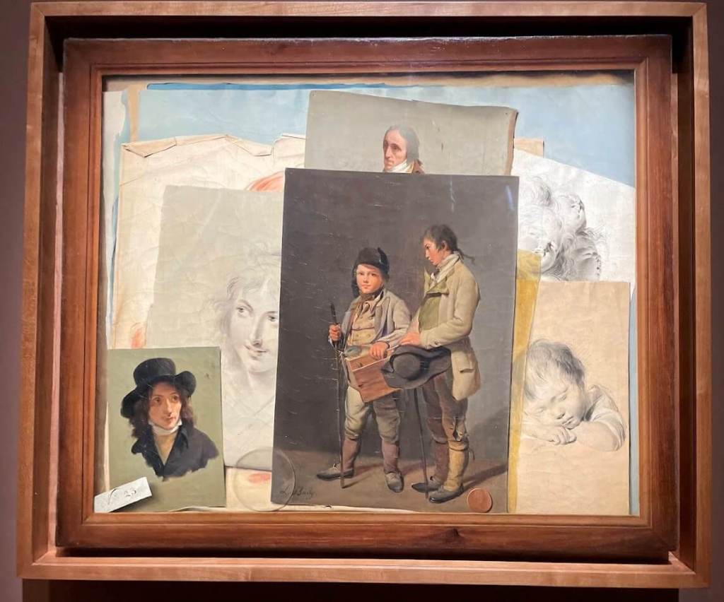 Louis Leopold Boilly Trompe-l’oeil’s artwork references everyday objects layering pictorial techniques. He juxtaposed images, manuscripts, broken glass, oil sketches, charcoal drawings, and coins. He even referenced his previous work, such as the “Reunion d’artistes dans l’atelier d’Isabey” (1798).