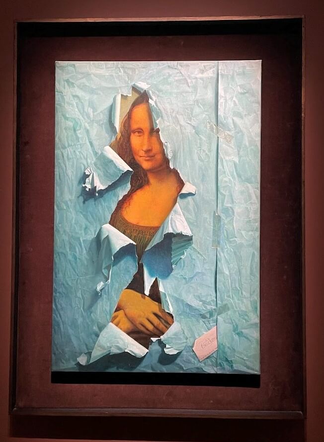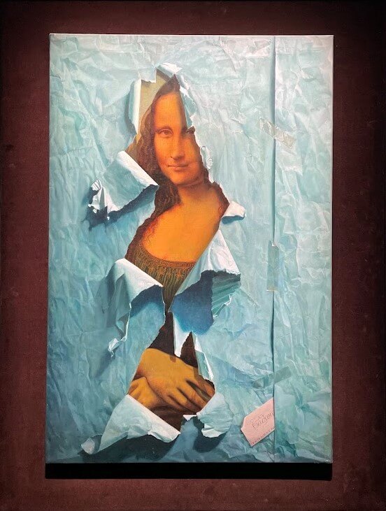 La Déchirure represents a blue torn piece of paper revealing behind an iconic painting: Mona Lisa. The illusion is so realistic with the mix of textures including crumpled paper, adhesive tape, and even Cadiou’s business card.