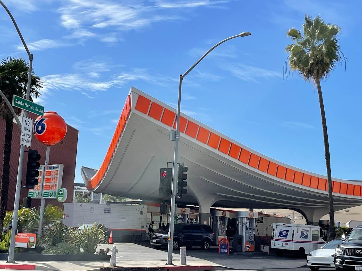 As you exit the residential neighborhood, find the elegant Beverly Hills City Hall, a Spanish Renaissance Revival masterpiece designed by William Gage and Harry Koerner in 1932. Don’t miss its outdoor structures and ornate towers. Next door, the Willis Annenberg Center for the Performing Arts occupies the historic 1933 Beverly Hills Post Office, blending classical architecture with modern performance spaces. Across the street, the 76 Gas Station, designed by Gin Wong in the 1960s, showcases the bold lines and futuristic flair of Googie architecture, a style born in Southern California.