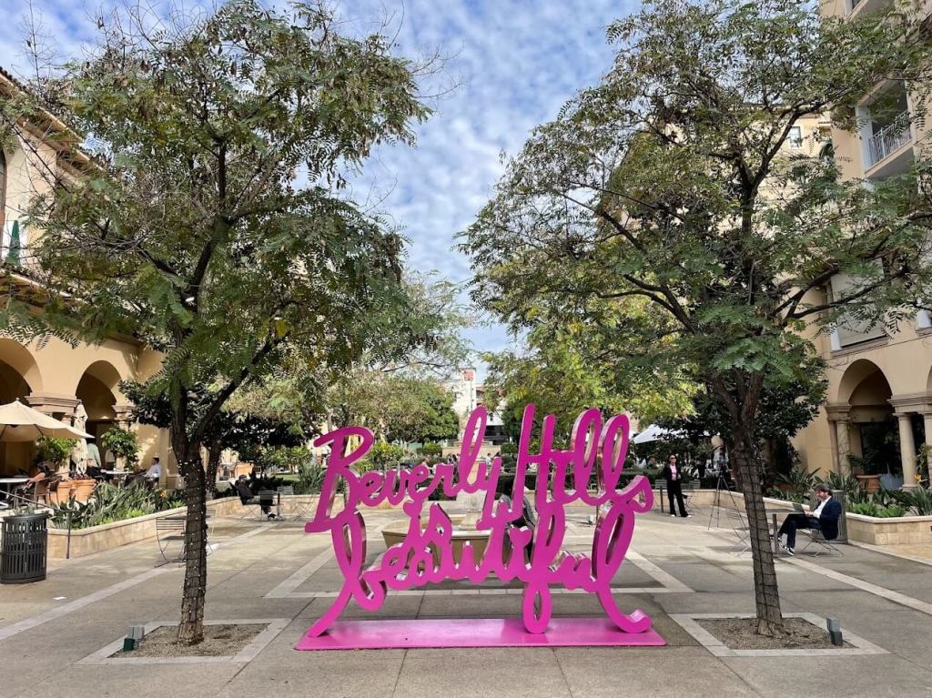 The first, a vibrant pink installation titled Beverly Hills is Beautiful (2019), invites passersby to capture a photo-worthy moment in front of its playful city slogan.